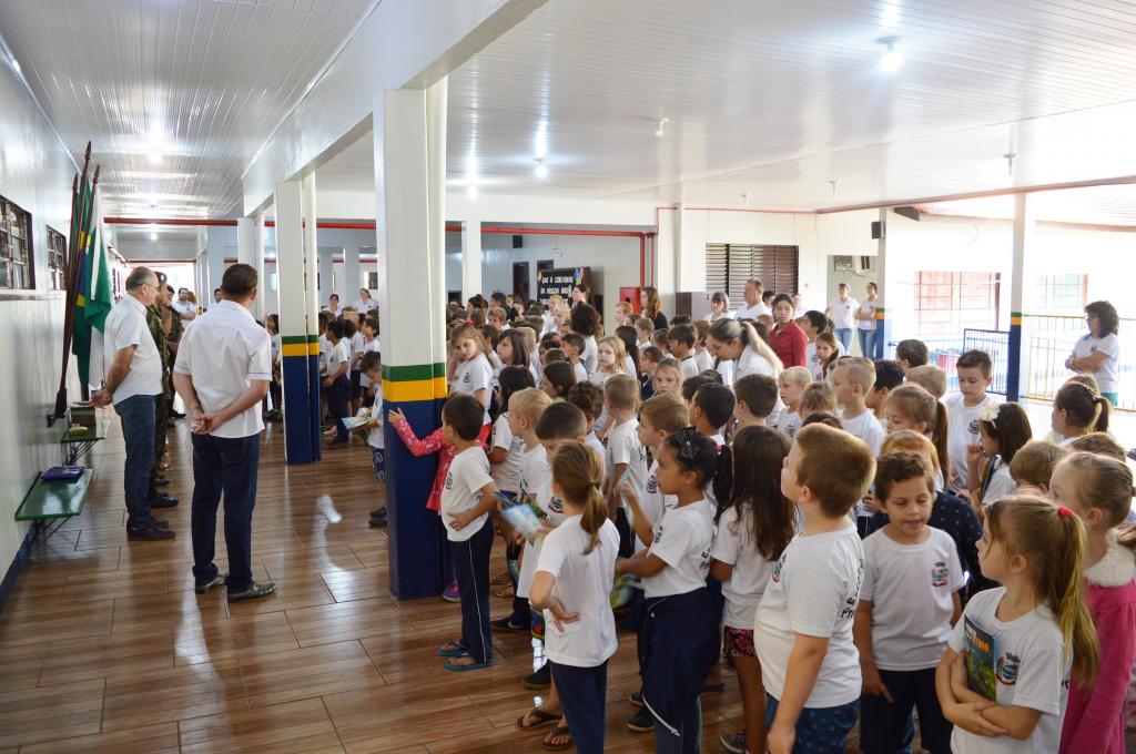 Na ocasião, os oficiais realizaram a entrega de exemplar da Bandeira Nacional e da revista infantil “Recrutinha”,onde o principal objetivo é de estimular os sentimentos de patriotismo e de civismo nos estudantes da Escola Municipal.