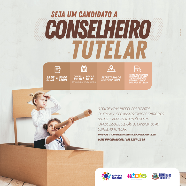 O Conselho Municipal dos Direitos da Criança e do Adolescente (CMDCA), através da Secretaria de Assistência Social de Entre Rios do Oeste, iniciaram no dia de ontem (29) as inscrições para a eleição dos novos conselheiros tutelares do município.