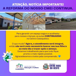 Reafirmamos nosso compromisso com a qualidade do ensino e com um ambiente seguro para as crianças e servidores. Agradecemos a compreensão e colaboração de todos e seguimos empenhados em entregar um CMEI renovado e mais adequado para o desenvolvimento dos pequenos.