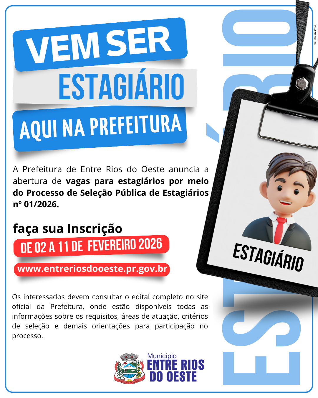 O Município de Entre Rios do Oeste anuncia a abertura das inscrições para o Teste Seletivo Nº 01/2026, com o objetivo de preencher vagas de Estagiários, conforme a legislação vigente. As inscrições ocorrerão entre os dias 02 e 11 de fevereiro de 2026, e os interessados deverão se inscrever pelo site oficial da Prefeitura: https://entreriosdooeste.pr.gov.br.